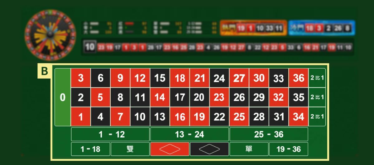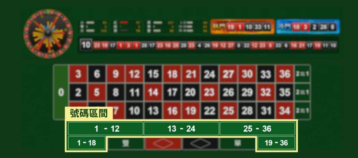 將代幣放在你想押的「1–12」、「13–24」或「25–36」格子,若小白球落在該範圍內,則獲得獎勵,常見賠率為 1:2。