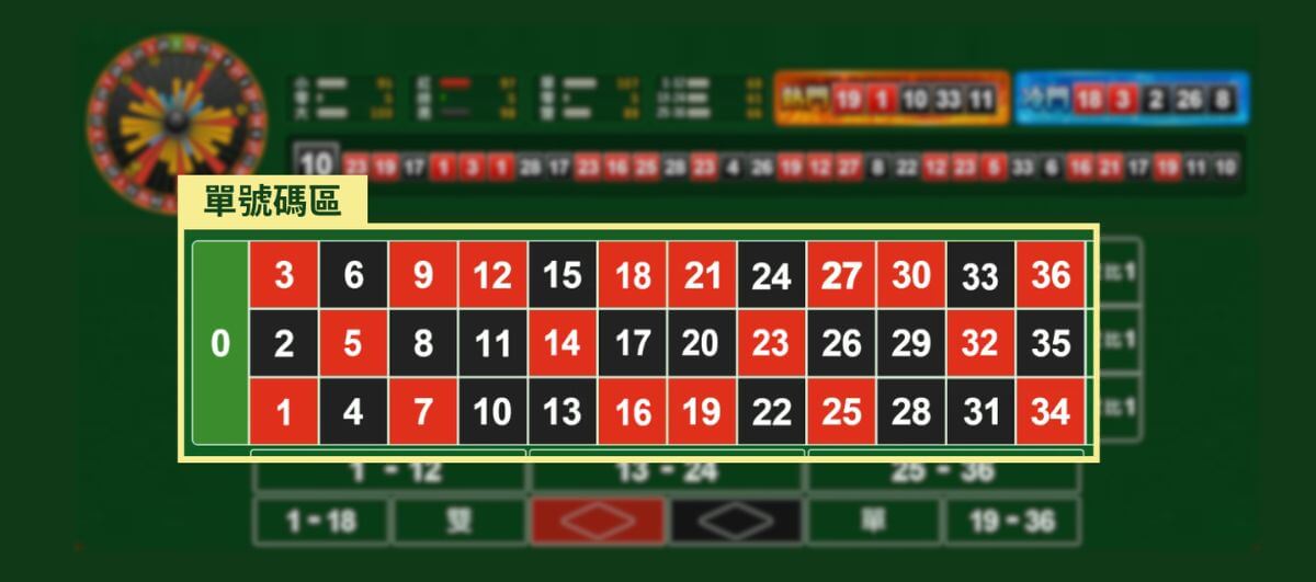 將代幣放在你想押的單一號碼格子上,若小白球停止時落在該號碼,則獲得獎勵,單號碼最常見的賠率為 1:35。