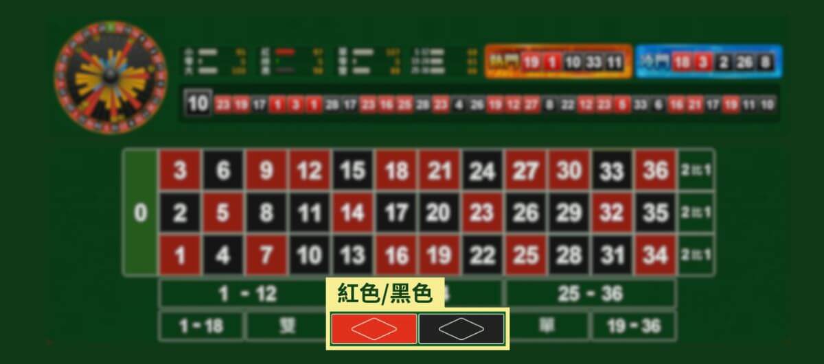 將代幣放在你想押的紅色、黑色格子上,若小白球落在該顏色區,則獲得獎勵,紅色/黑色最常見賠率1:1。